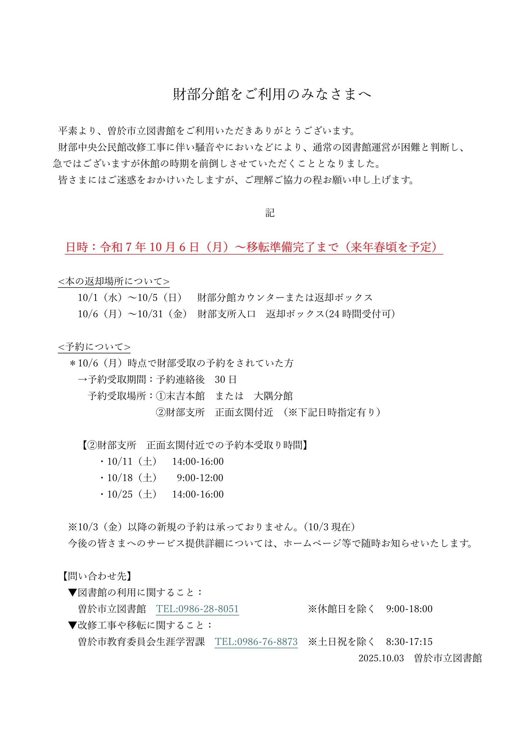 リンク:【曽於市HP】曽於市立図書館財部分館の長期休館について(お知らせ)