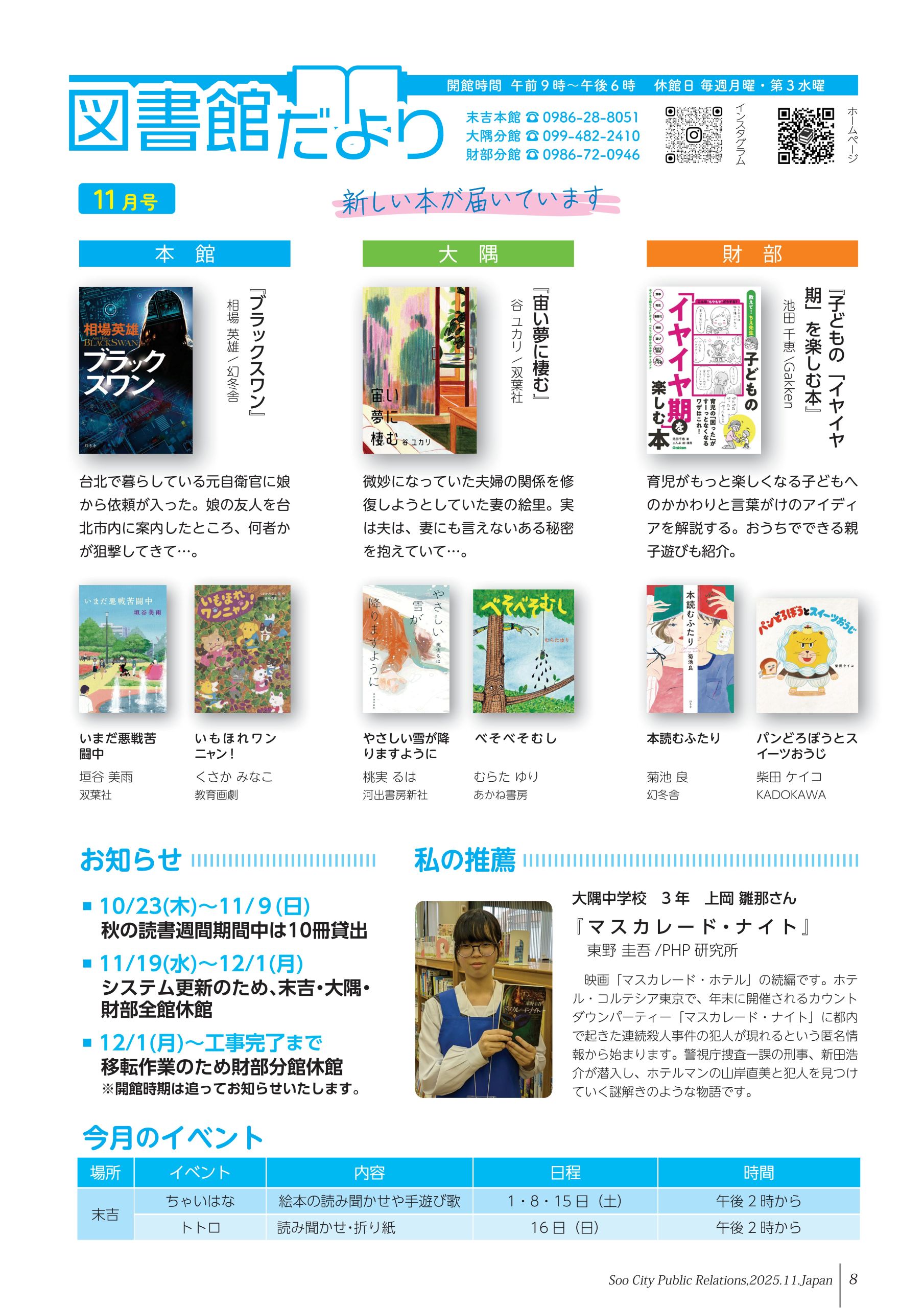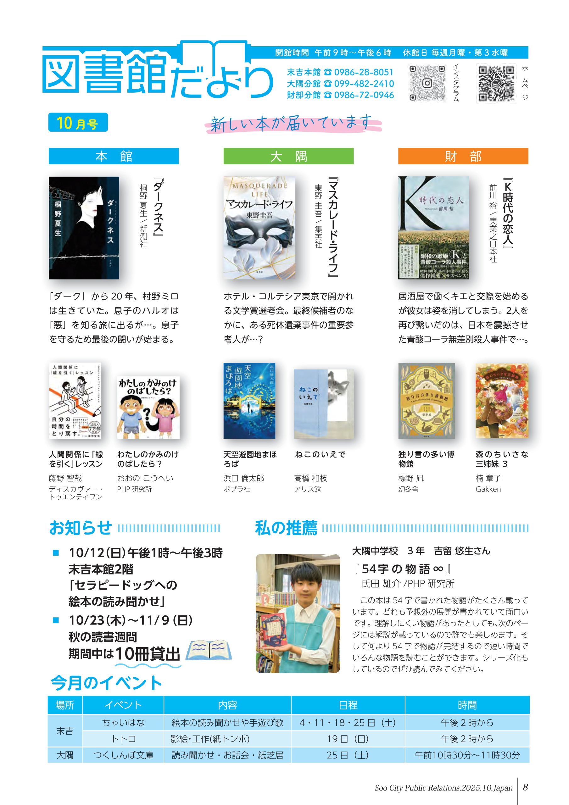 曽於市立図書館では、図書館システム更新のため、 下記の期間において臨時休館及び相互貸借(他の図書館からの本の借用)を停止させていただきます。 相互貸借の受付は休館明けになりますので、よろしくお願いいたします。 休館期間 […]